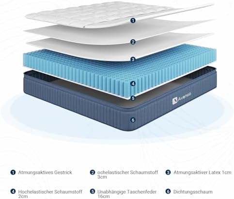 【Respiring & Comfortable】Diese Taschenfederkernmatratze verfügt über hochdichte gestrickte Schichten mit exquisiter, hautfreundlicher Textur und Plüschgefühl für zusätzliche Atmungsaktivität und Komfort, so dass Ihr Körper während des Schlafs bequem und trocken bleibt; Das heißt, wenn Sie in einer feuchten Nacht auf der Avenco-Matratze schlafen, werden Sie nicht durch Schweiß belästigt