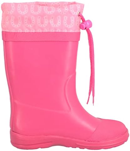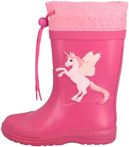 Pink Wellington Boots by Beck | beck.shoes. A dream in pink. Natural rubber rubber boots for girls with great unicorn motif. Protects against wind and weather and keeps feet dry thanks to the waterproof properties. Non-slip outsole with tread for a secure grip. Textile inner lining and removable sole provide optimal comfort. The cuff with cord protects against snow and rain and is printed with a great horseshoe pattern.