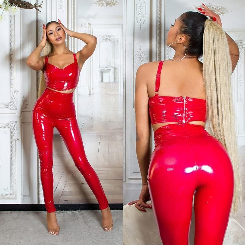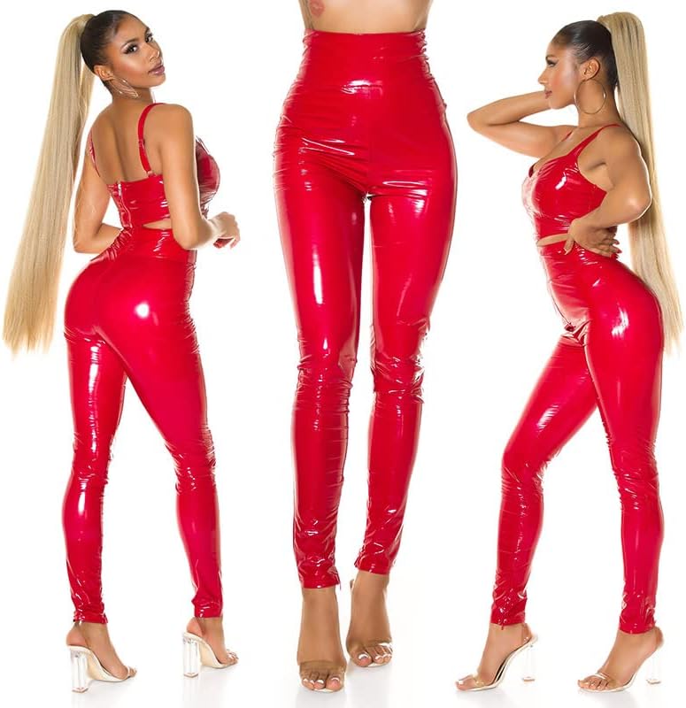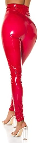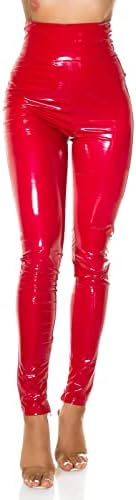 High-waist leggings made from thin stretch material with shiny latex look surface. Stitched, extremely wide waistband.