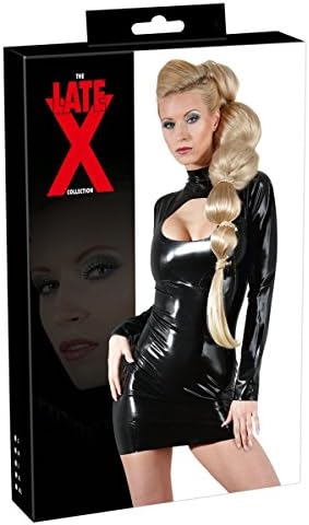 Bright ultra-short latex dress with large peephole. Zip in the back for easy on and off. With stand-up collar and long sleeves. Black Latex (made using natural rubber latex, which can cause allergies).